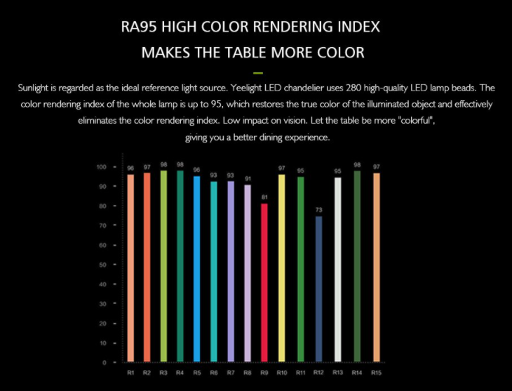 Chỉ số hoàn màu cao Ra95 cho nguồn ánh sáng tương phản tốt, sắc nét và gần với màu của ánh sáng tự nhiên. Nhiệt độ màu có thể tùy chỉnh 2700K-6000K giữa ánh sáng ấm và lạnh phụ thuộc vào nhu cầu sử dụng của người dùng.
