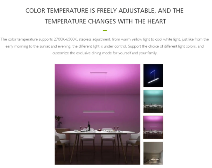 - Hỗ trợ nhiệt độ màu 2700K - 6500K, điều chỉnh vô cấp, từ ánh sáng vàng ấm đến ánh sáng trắng dịu mát cho bạn và gia đình một không gian bữa tối lãng mạn