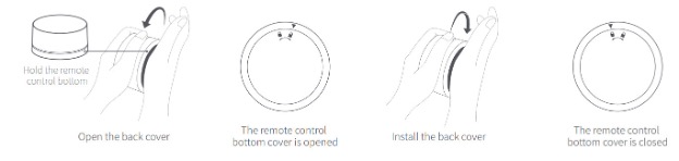 - Giữ cạnh dưới của điều khiển từ xa bằng một tay, nhấn vào đệm chống trượt dưới cùng bằng tay kia và xoay ngược chiều kim đồng hồ để mở nắp sau của điều khiển từ xa.